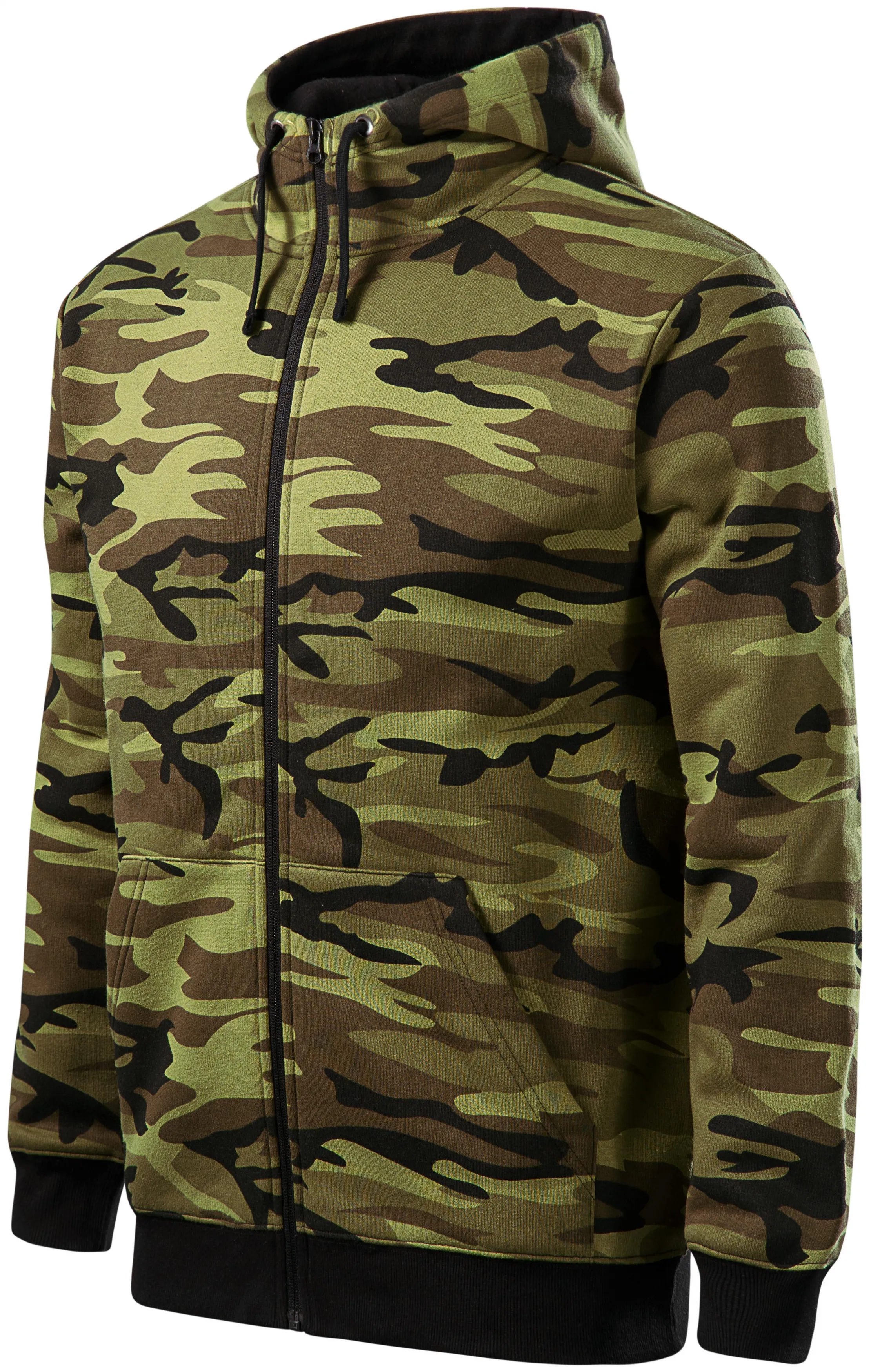 Herrtröja med dragkedja och huva i kamouflage-design.
